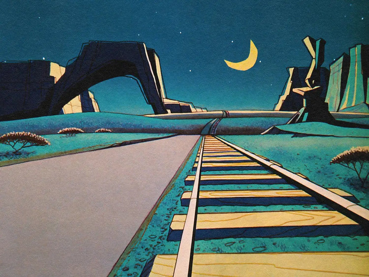 Whizzing through the desert night, Wile E. Coyote's endless pursuits reach astronomical heights in "Chase the Moon" from "Beep Prepared." This piece captures that fleeting moment of moonlit mayhem, where the cosmos playfully conspires with our favorite road runner. For collectors who know that sometimes, chasing dreams (or road runners) can be a celestial comedy!