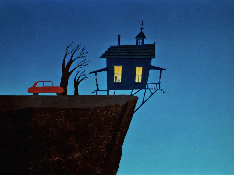 From "Bugs and Thugs", "Precarious Perch" showcases peak Looney living. A red car, teetering trees, and a house living on the edge... literally. It’s not just art, it's a piece of animated history, all hanging by a hare!