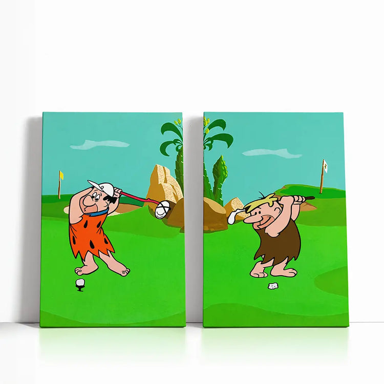 Celebrate your days on the green with this limited-edition canvas diptych featuring Fred Flintstone and Barney Rubble swinging their clubs!