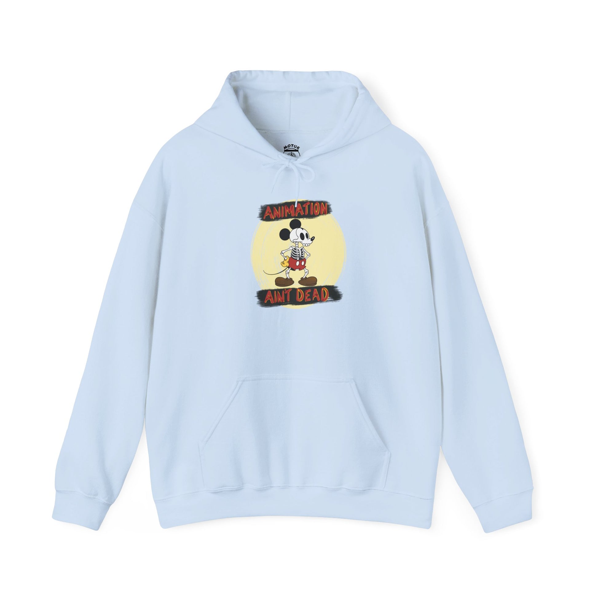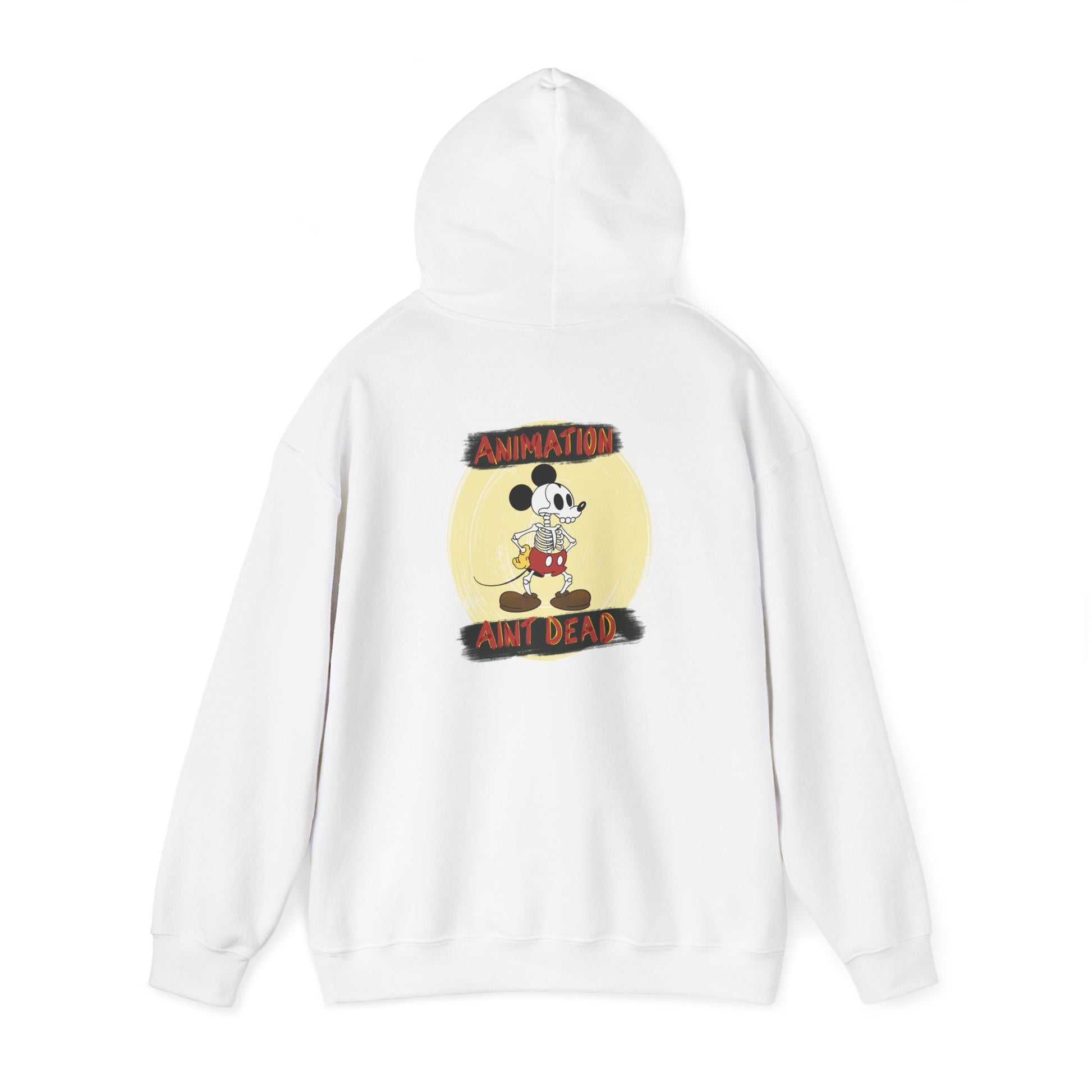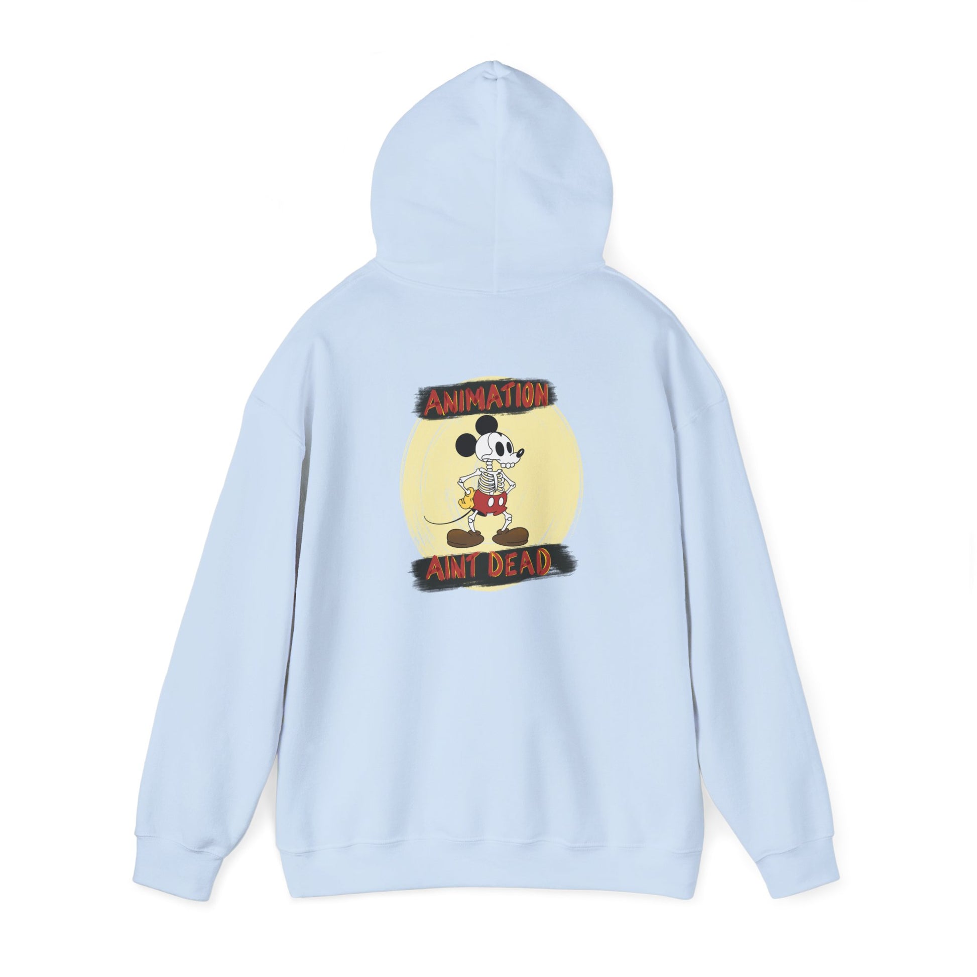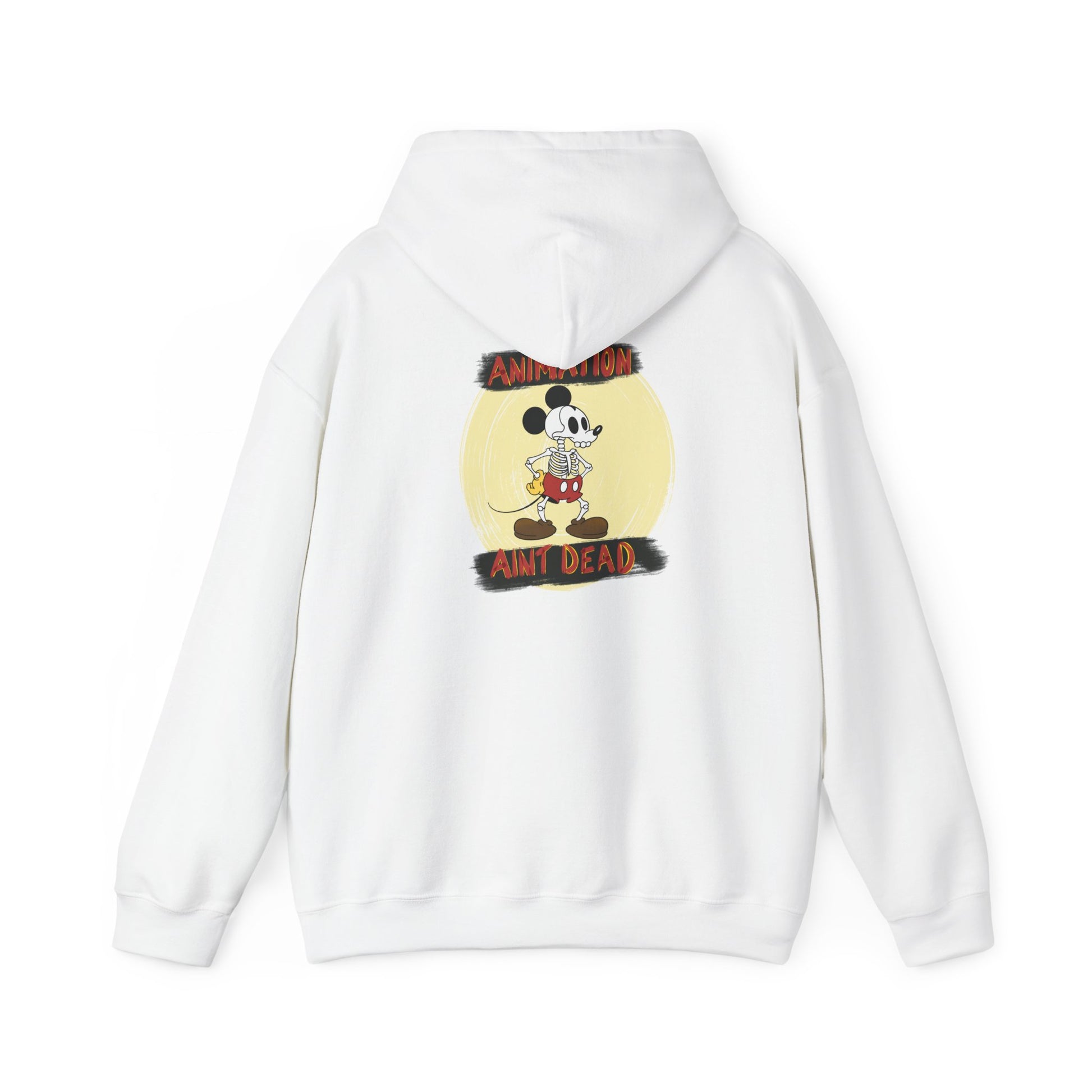 This heavyweight black hoodie features our “Animation Ain’t Dead” design — a vintage-style mouse skeleton standing proudly under a retro cartoon spotlight. It’s bold, a little spooky, and a whole lot of animation history wrapped into one killer graphic.