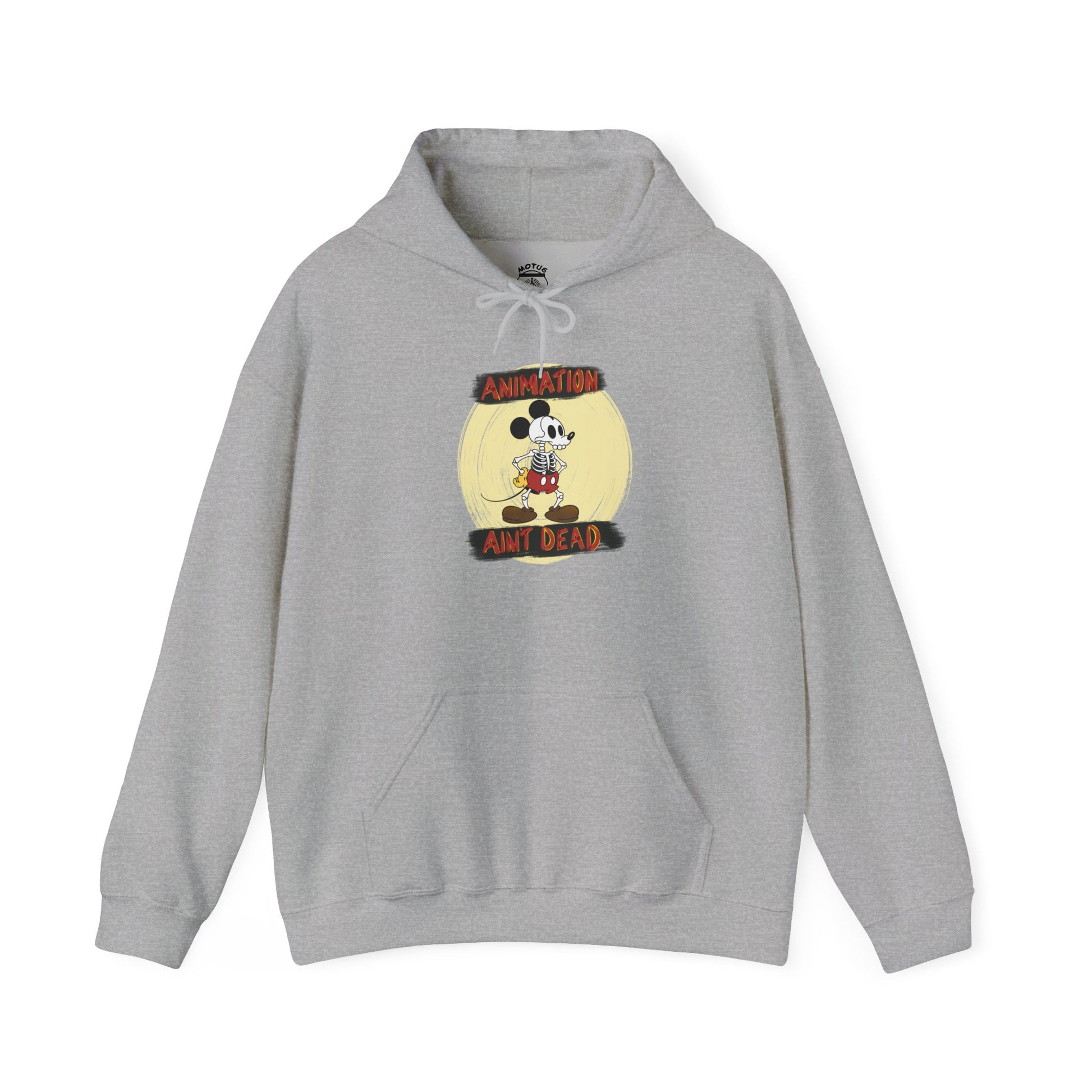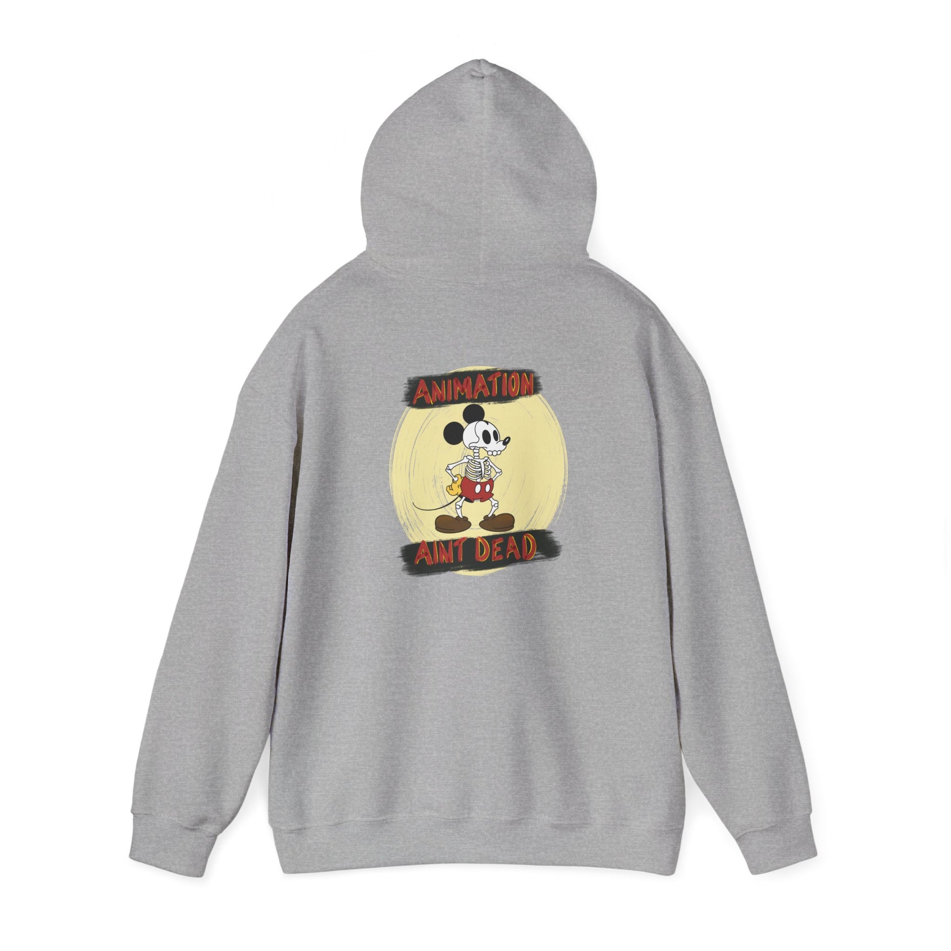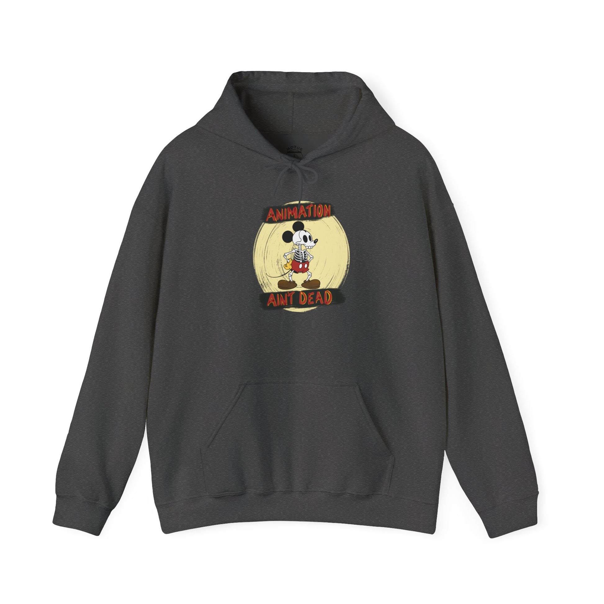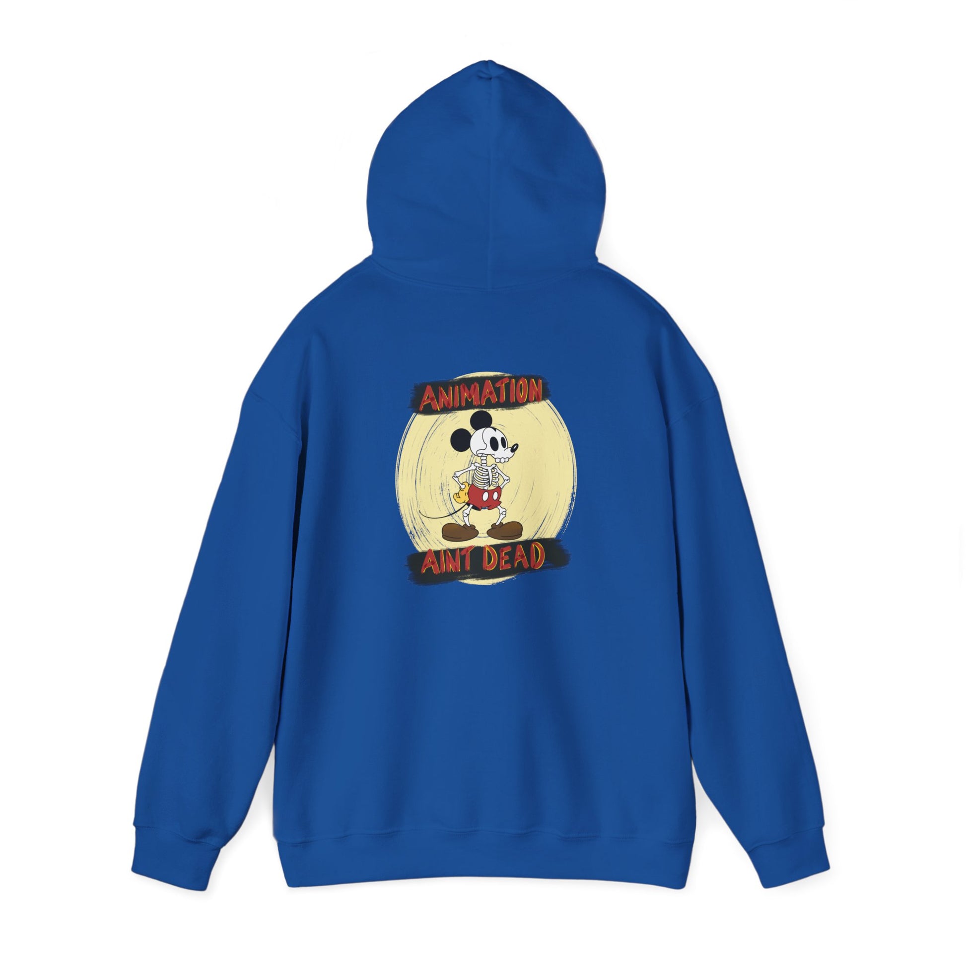 This heavyweight black hoodie features our “Animation Ain’t Dead” design — a vintage-style mouse skeleton standing proudly under a retro cartoon spotlight. It’s bold, a little spooky, and a whole lot of animation history wrapped into one killer graphic.