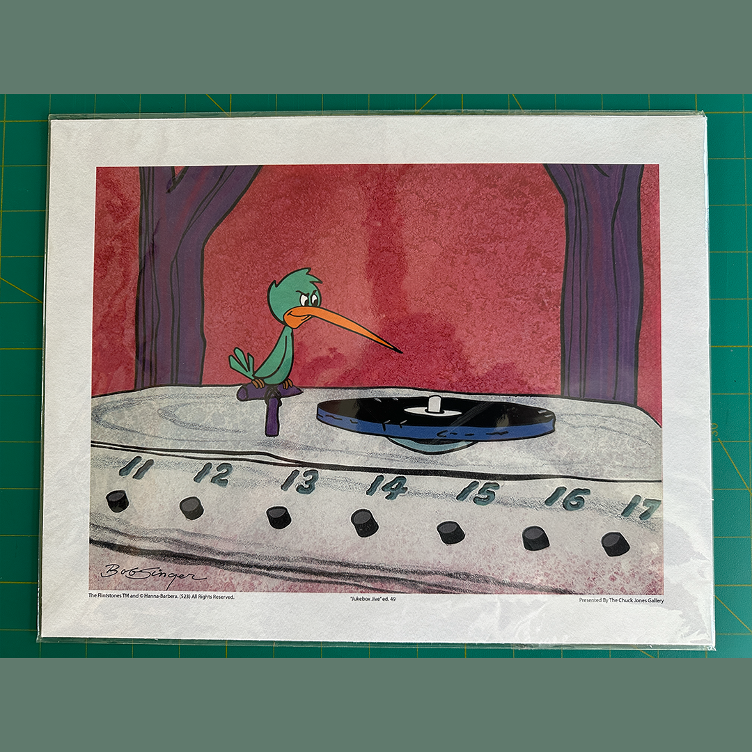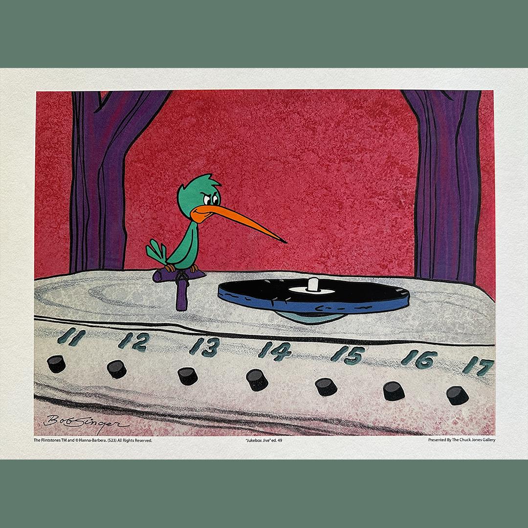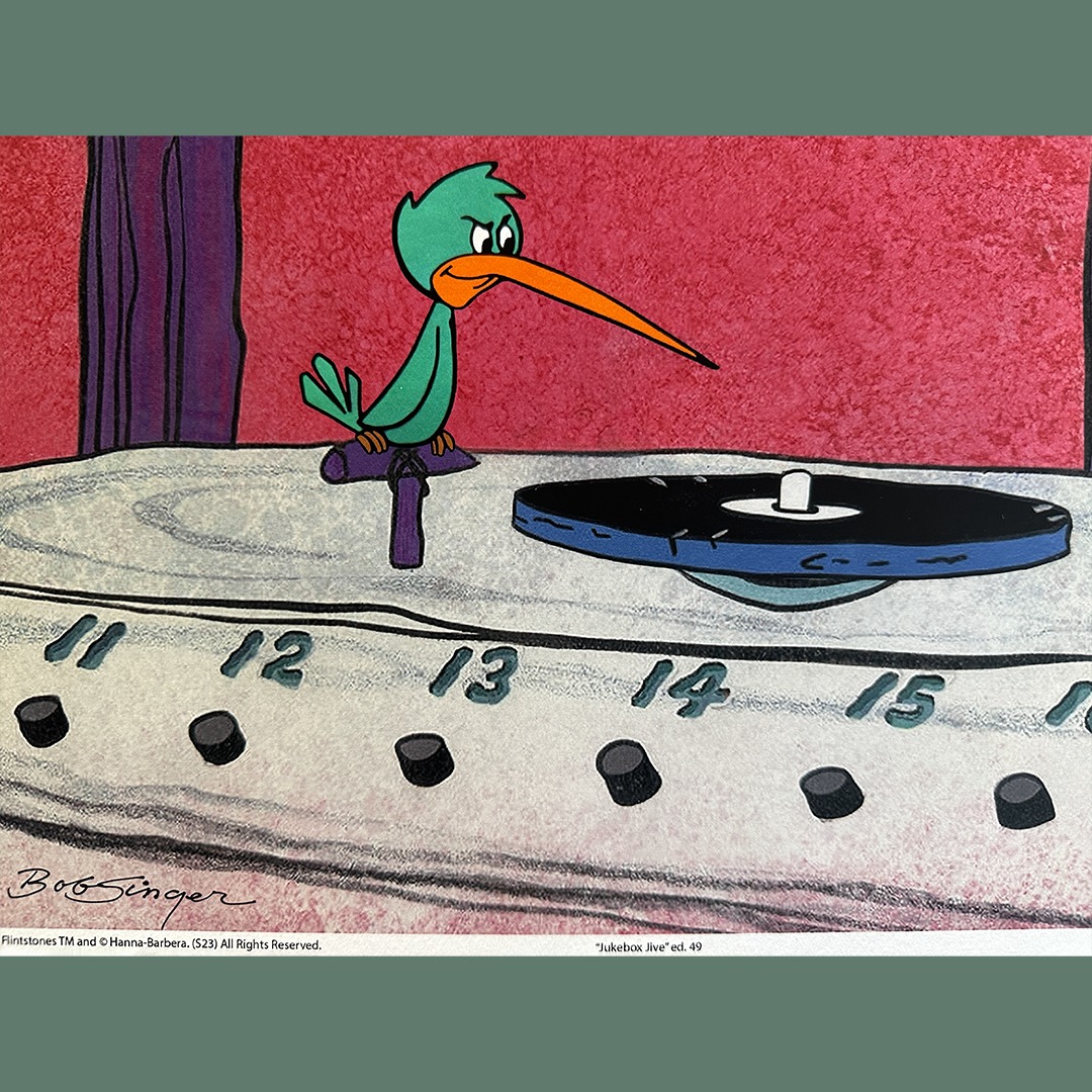 This limited edition artwork captures a classic moment from The Flintstones, showcasing the Stone Age charm of their prehistoric jukebox—powered, of course, by a helpful bird! Measuring 11"x14", this piece is from an exclusive edition of only 49. What makes this particular piece truly one-of-a-kind? It’s the only edition ever signed by legendary Hanna-Barbera artist Bob Singer. While Singer didn’t create this specific artwork, his signature adds an extraordinary connection to the golden age of TV animation. A must-have for Flintstones fans and serious collectors alike.