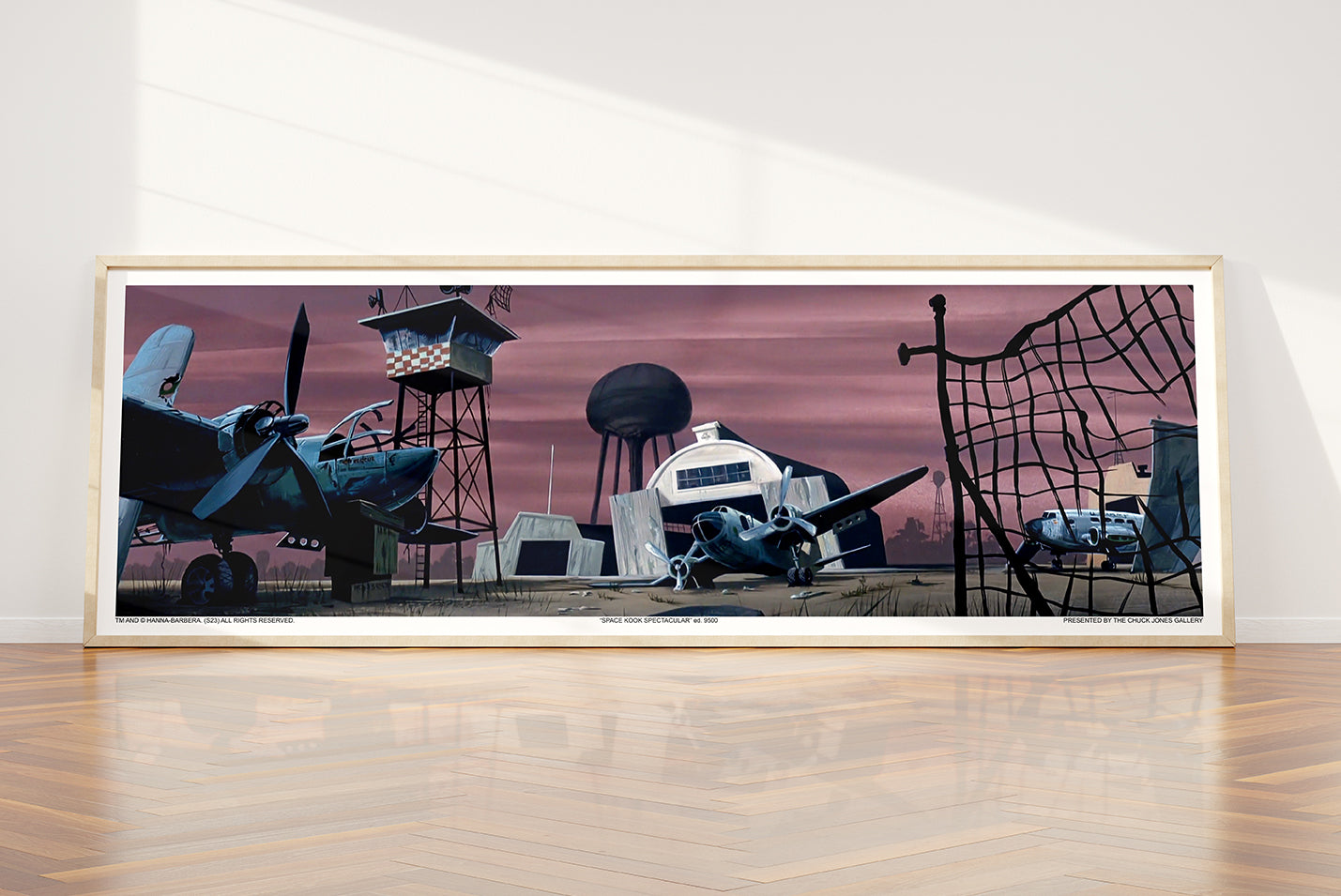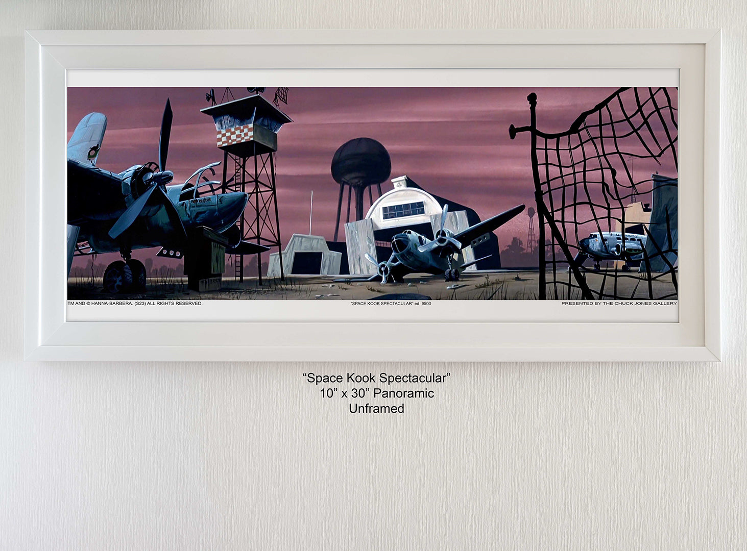 Feast your eyes on this jaw-dropping panoramic background of the abandoned airfield featured throughout the episode! This stunning piece of art showcases the eerie setting where the Scooby-Doo crew encounter a spooky skeleton in a space suit, whose villainous laugh is sure to give you goosebumps. The background artist's incredible attention to detail created a rich tapestry for the animators to stage the rest of the action. Episode: Spooky Space Kook Year: 1969 Directors: Joseph Barbera & William Hanna Background Artists: Ron Dias, Gary Niblett, Daniela Bielecka, Rolly Olivia.